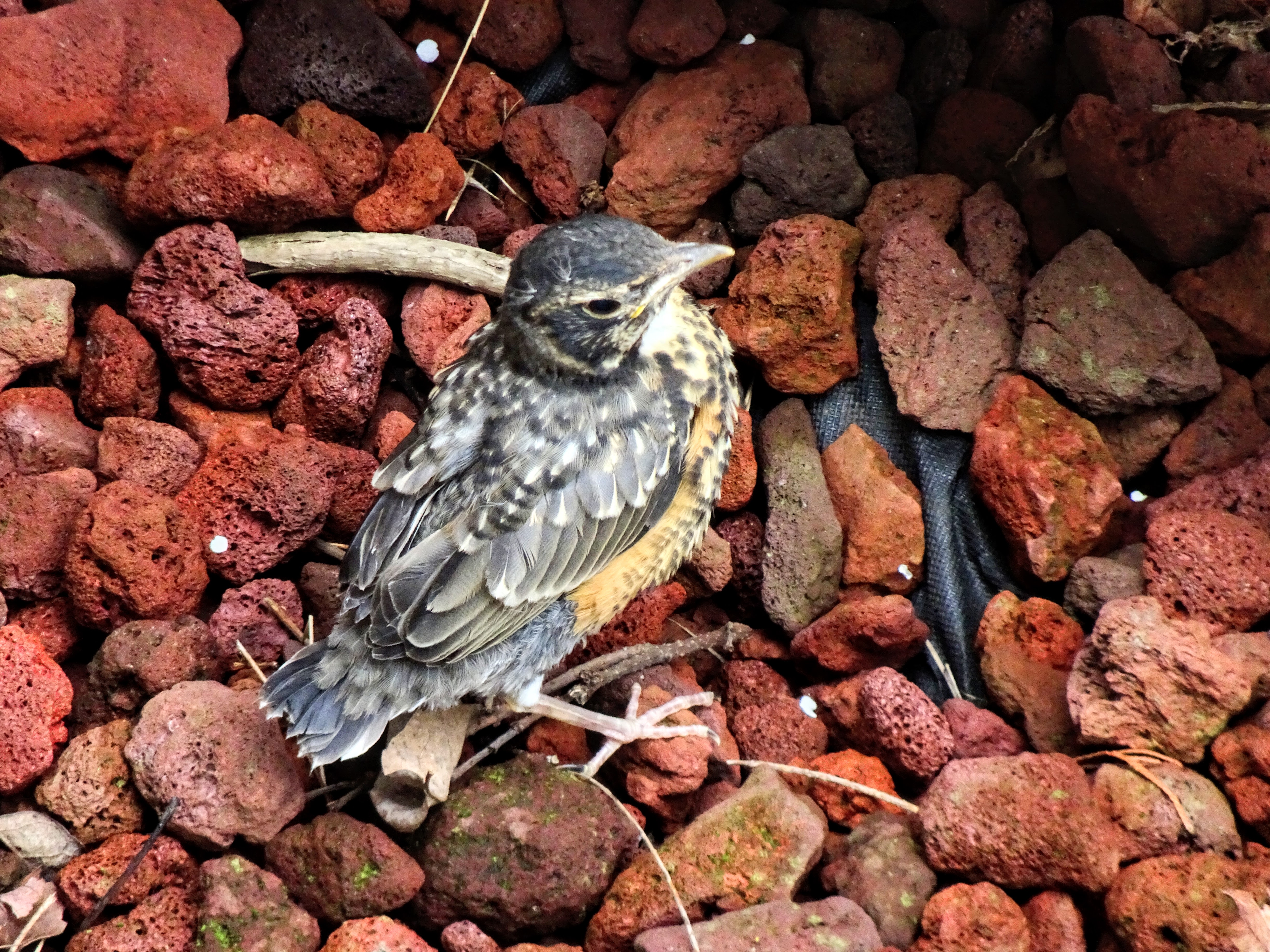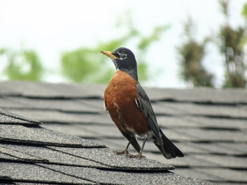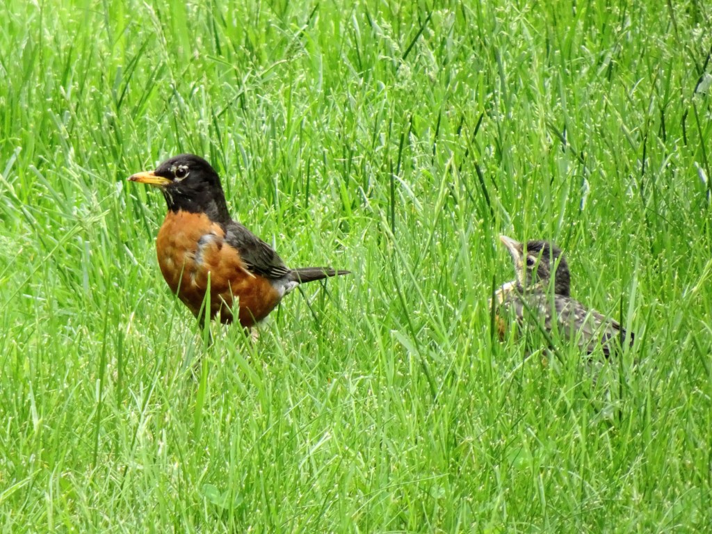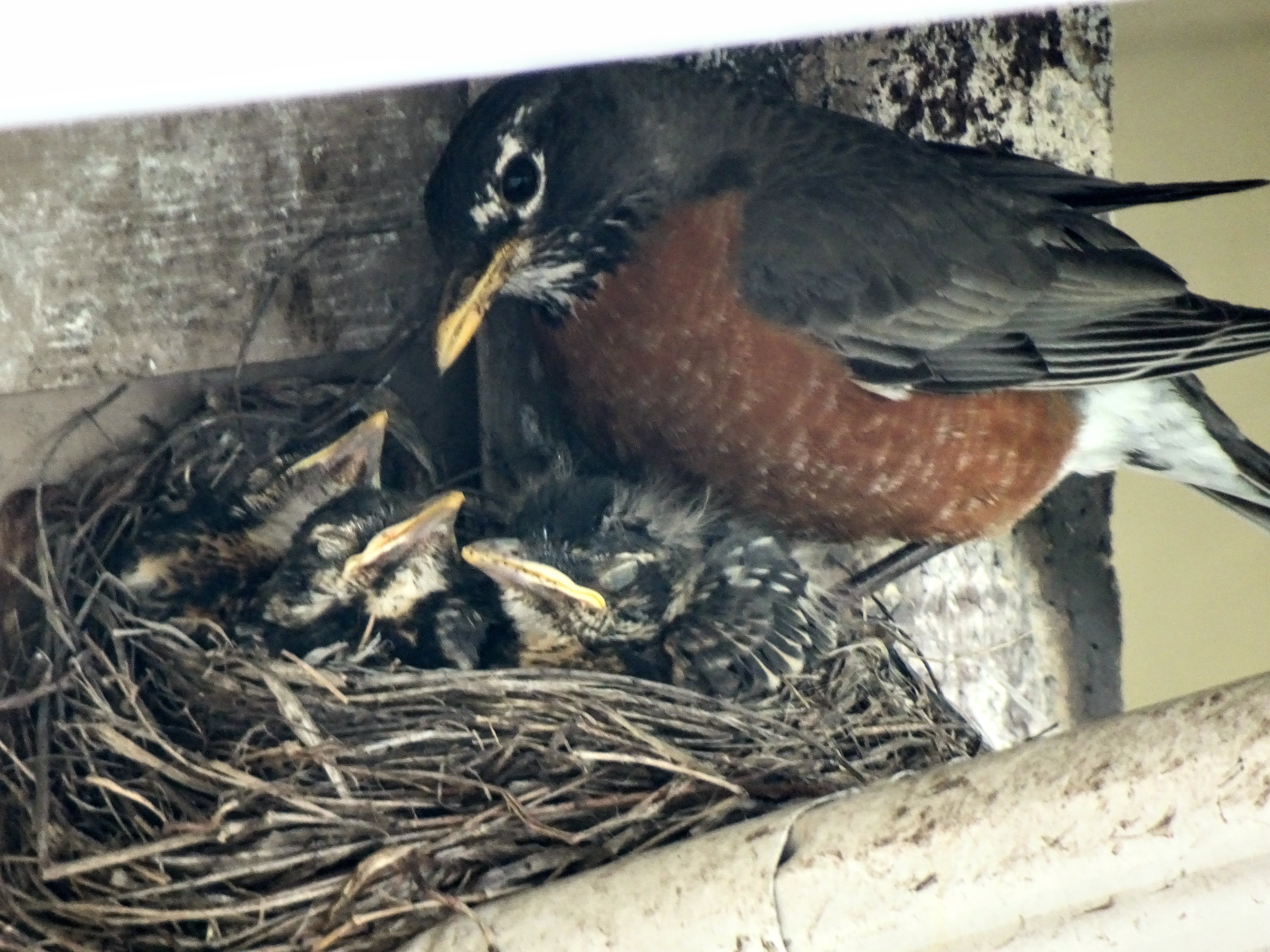 It turns out it was a female robin defending her tiny home against all comers – and you can’t help but admire her put-your-life-on-the-line moxie!  Over and over, she screeched and dived at any-and-all comers, particularly us, as we entered and exited through the front door. The only time she sat quietly in their nest of twigs atop the joint of a downspout was when her mate took over the defense of their babies.